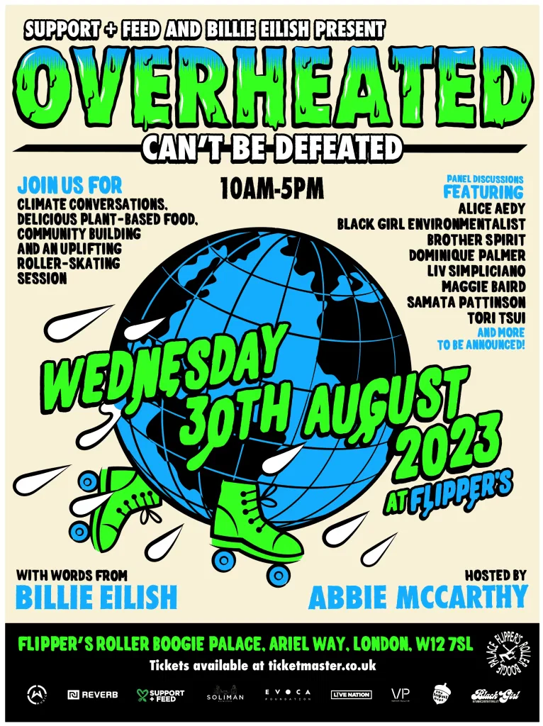 Billie Eilish attended the event alongside guests, including Earthrise CEO Alice Eady, BLACK PEARL CEO Samata Pattinson, and climate activists Dominique Palmer and Tori Tsui, with more announced. Support+Feed Founder Maggie Baird co-organised the event which saw BLACK PEARL deliver sustainable fashion programming, and join partners such as EVOCA Foundation, REVERB, and LIVE NATION. 500 tickets for OVERHEATED were sold for the event which was live-streamed on Eilish’s YouTube channel in partnership with Mercury Studios.