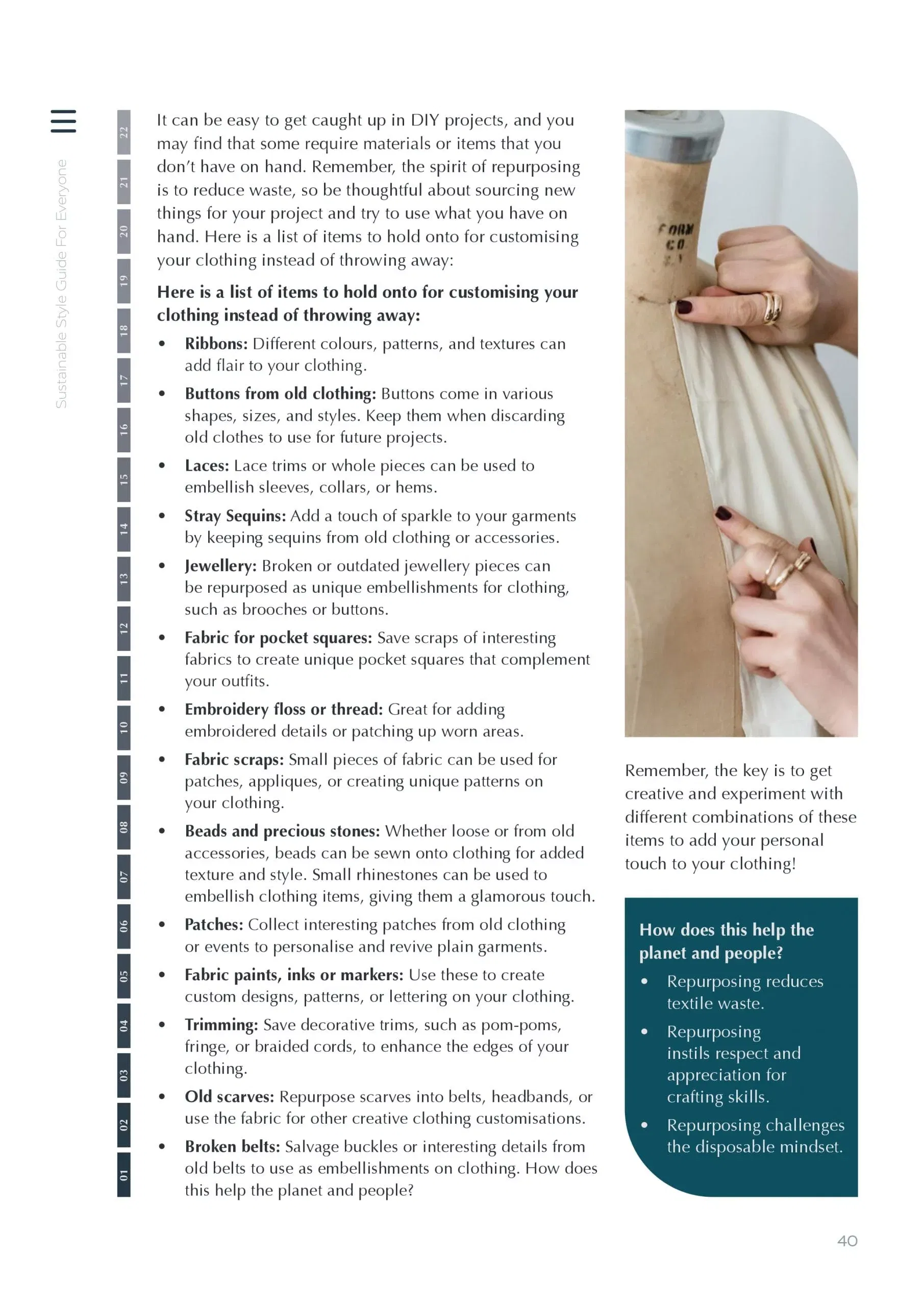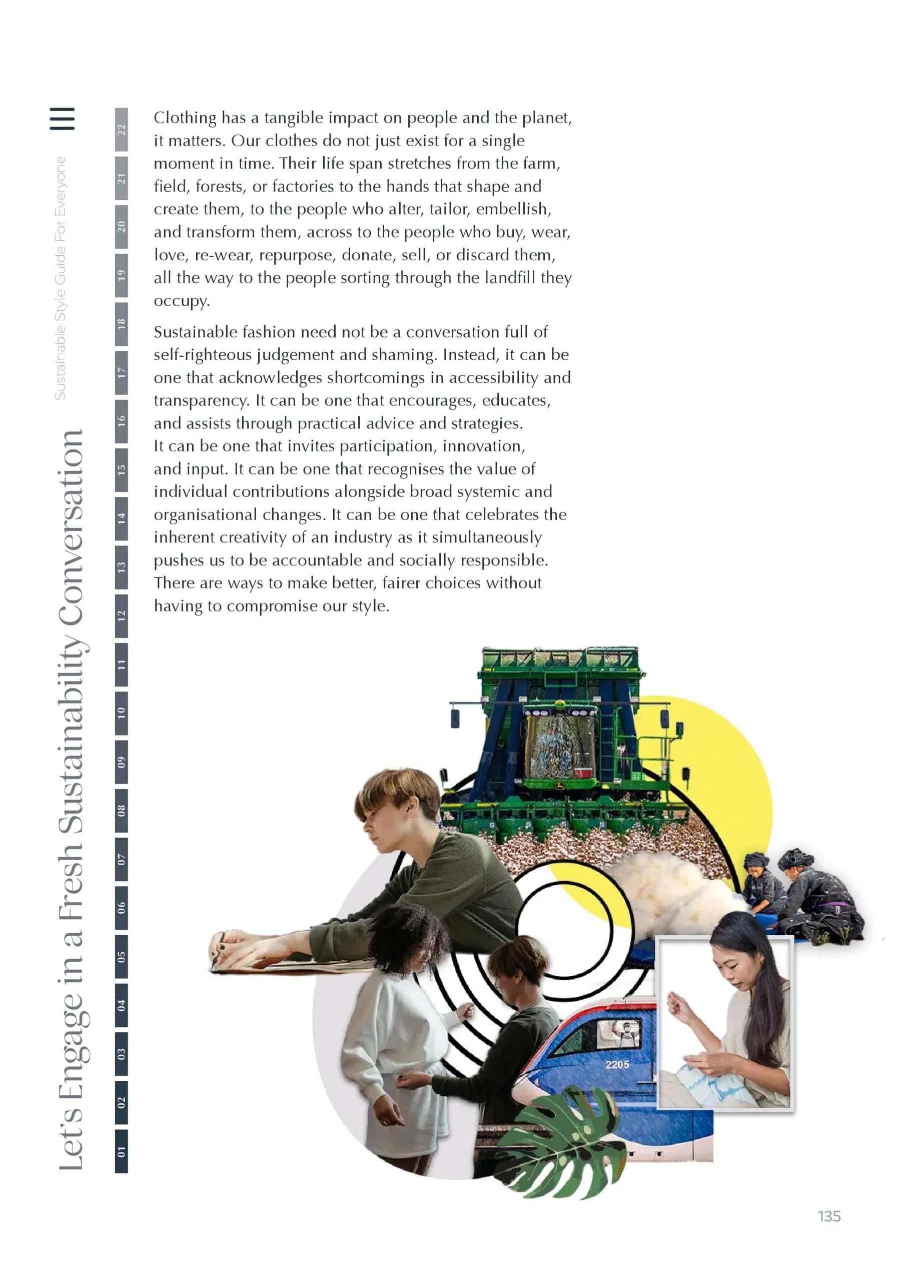 This new approach also acknowledges that at times, sustainability discussions have felt elitist, distant, and alienating, depriving people of the opportunity to make sustainable decisions—decisions informed by truth. This guide responds to the need for a fresher, more relatable conversation about sustainable fashion—highlighting how sustainability doesn’t mean sacrificing style and how it can represent our identities, our creativity, our passions, and our values.